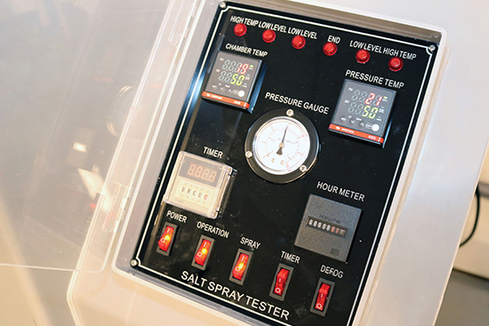 Unsere hauseigenen Testeinrichtungen wurden um einen Haltbarkeitstest erweitert, mit dem wir zyklische Tests über mehrere Tage mit unterschiedlichen Belastungen durchführen können. Neben diesem Equipment haben wir auch einen Zug- und Drucktester und unsere Salzkammer für Korrosionstests.