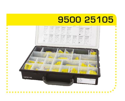 Im Deckel des Sortimentskastens befinden sich Informationen über die Position der Ablassschrauben in dem Kasten, Dimensionen, Gewinde, Montagewerkzeug, Querverweise und Artikelnummer für das Wiederbestellen loser Ablassschrauben. Die Ausnahme hierzu ist die Plastikablassschraube mit der Triscan Nummer 9500 0929, die in 5-teiligen Tüten nachbestellt werden kann.