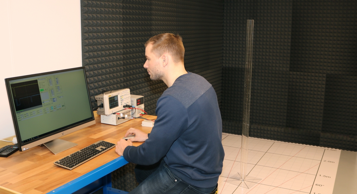 To prevent the sound waves from being reflected incorrectly, the walls adjacent to the measurement area are covered with a special absorbent foam material