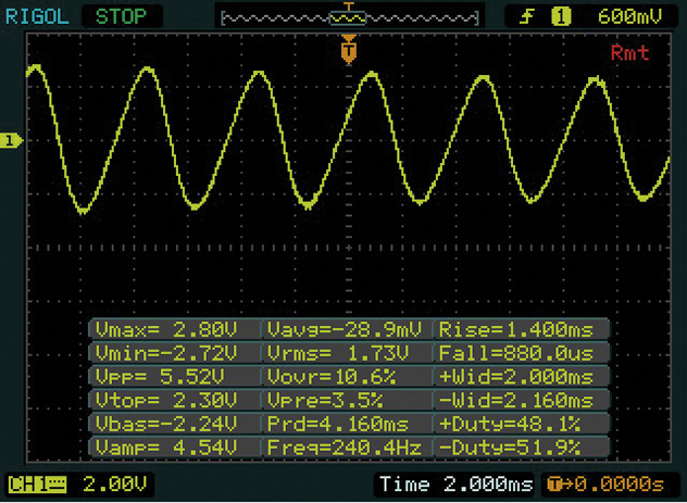 Här ses det bölja sinussignalen från en passiv ABS-sensor, som arbetar med en ABS-ring med tänder