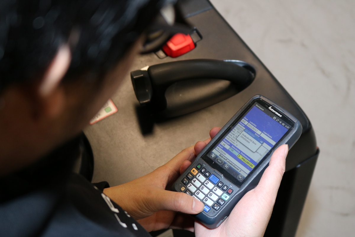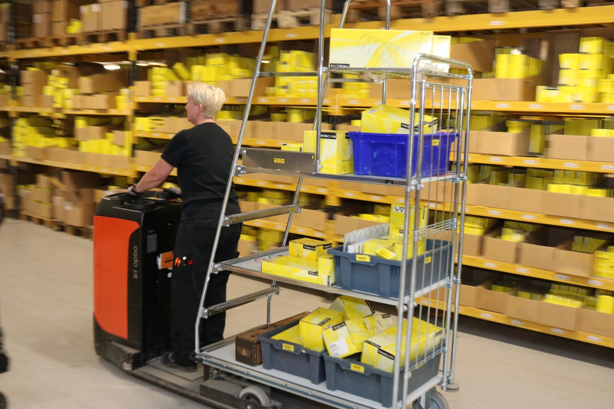 Ordrar som skickas till plockning distribueras automatiskt till våra logistikmedarbetares handskannrar, där plockningen sätts igång. Handskannrarna har just uppdaterats till att stödja vårt nya 5Ghz trådlösa nätverk, vilket garanterar både stabil och snabb kommunikation. För att göra plockningen av små order mer effektiva har vi infört användningen av elbilar, därmed har vi kunnat minska tiden som förbrukats jämfört med tidigare.