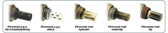 • Fosfor från motorolja som har gjort sin väg till förbränningskamrarna (otätta ventilstyrningar och ventiler, slitna kolvringar eller cylindrar)